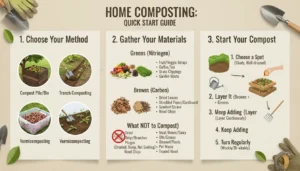 Home composting is a practical, low-cost habit that benefits your garden and the environment. With basic care and a small routine, beginners can produce rich compost in months rather than years.