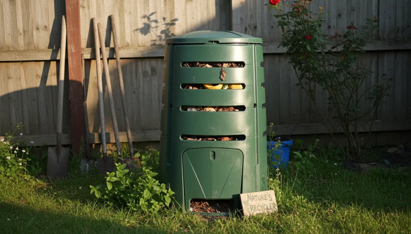 - Compost bin or tumbler (or a simple wire enclosure).